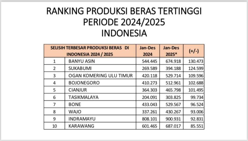 Berdasarkan data yang dirilis Kementerian Pertanian Republik Indonesia, Kabupaten Banyuasin menduduki posisi pertama sebagai daerah dengan produksi beras tertinggi sepanjang tahun 2025, mengungguli Sukabumi di posisi kedua dan OKU Timur di posisi ketiga.